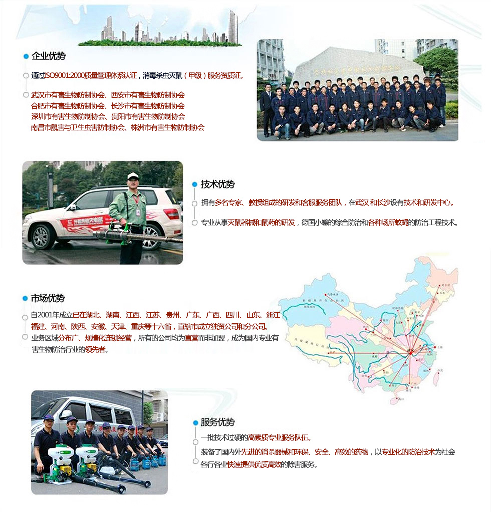 我們堅(jiān)持“誠(chéng)信、高效、安全、環(huán)保”的服務(wù)宗旨,所用器械均為世界優(yōu)質(zhì)產(chǎn)品,所用藥物均系國(guó)家藥檢部門(mén)和衛(wèi)生防疫部門(mén)批準(zhǔn)的安全、低毒的城市衛(wèi)生用藥,并根據(jù)具體作業(yè)環(huán)境和防治對(duì)象情況變化,制定具體防制方案,保證優(yōu)越的防治效果和人體安全。